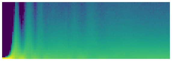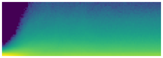 This shows a classic picture of “bad training.” We start with nearly all activations at zero—that’s what we see at the far left, with all the dark blue. The bright yellow at the bottom represents the near-zero activations. Then, over the first few batches we see the number of nonzero activations exponentially increasing. But it goes too far, and collapses! We see the dark blue return, and the bottom becomes bright yellow again. It almost looks like training restarts from scratch. Then we see the activations increase again, and collapse again. After repeating this a few times, eventually we see a spread of activations throughout the range.